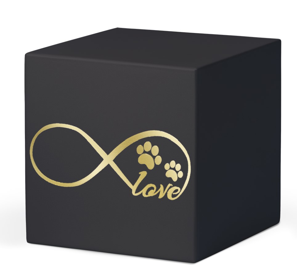 Tierurne aus Stahl. Veredelt sind diese Urnen mit dem Unendlichkeitszeichen, dem Wort Love und einem kleinen Herz. Dies soll die unendliche Liebe ausdrücken, die man seinem Tier gegenüber empfindet.