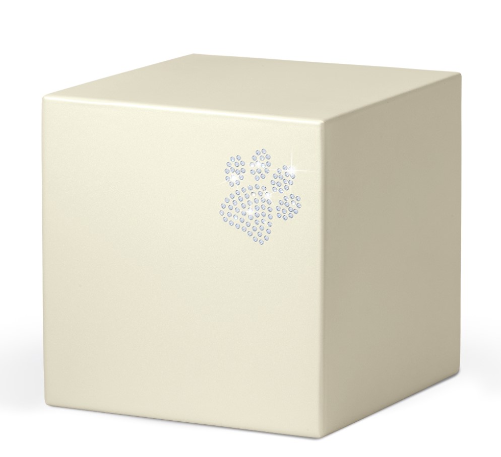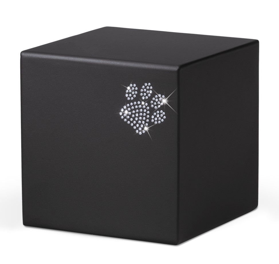 Massive Tierurne aus Stahl. Veredelt sind diese Urnen mit einer Pfote aus Kristallsteinen, was ihren edlen Charakter unterstreicht.