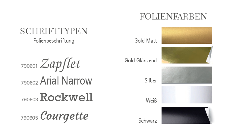 Folgende Farben stehen für die Folienbeschriftung zur Verfügung : Gold, Silber, Schwarz, Weiß